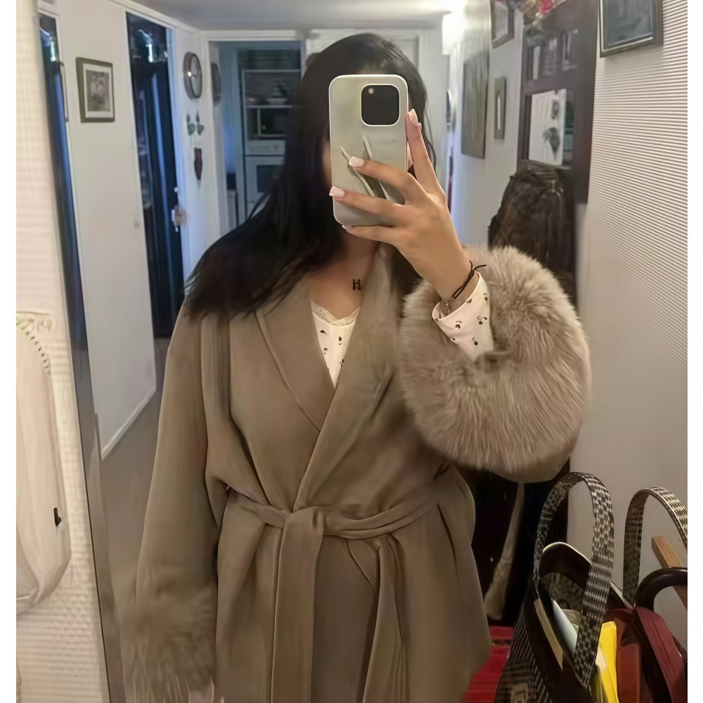 Der Regine Kunstpelz-Mantel kombiniert luxuriöse Wärme mit einer femininen, taillierten Silhouette. Der elegante Kunstpelzbesatz an Kragen und Ärmeln verleiht ihm eine edle Note, während der Gürtel die Taille betont und für eine schmeichelhafte Form sorgt. Perfekt für kalte Wintertage – stilvoll, gemütlich und vielseitig tragbar.